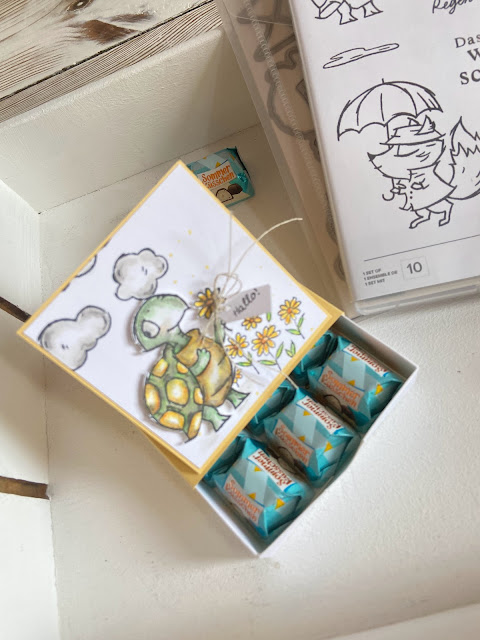 Mit dem zauberhaften Produktpaket "Wetterfest" aus dem aktuellen Minikatalog Januar - April 2023 habe ich eine kleine Pop-Up Verpackung gestaltet, die ich dann mit Küsschen gefüllt habe.